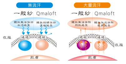 Qmaloft羊毛系列多孔中空架構使汗水在纖維間形成隔熱水膜,達到溫控效果。當織物吸收汗氣超過一定程度後,隔熱水 |