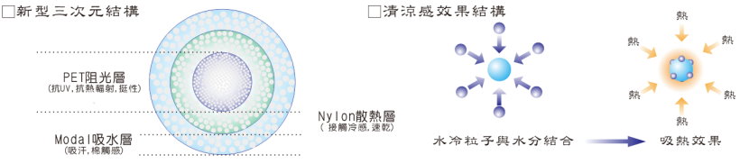 : 冷棉的中層採用尼龍高含水率材質,可提升紗的冰涼感及柔軟感。 |