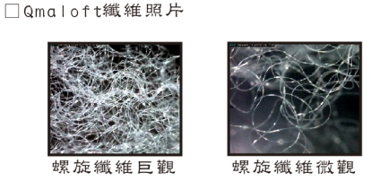 Qmaloft製品具易壓縮及可機洗特性,可以製成外套、睡袋、棉被、手套等商品。該螺旋中空纖維具記憶效果,當產 |